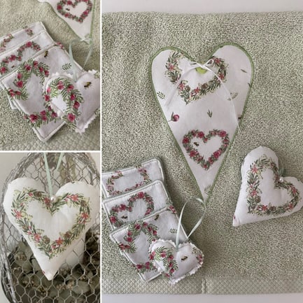 Gästehandtuch schilf mit Herzapplikation, dazu 3 Reinigungspads fürs Gesicht, dazu ein passendes Herz zum aufhängen und ein kleines mit Lavendelbefüllt für den Schrank
