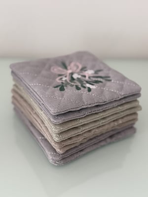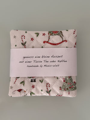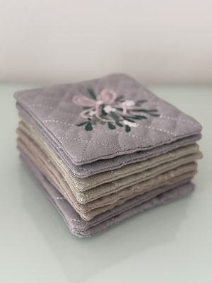 Da die Tage nun merklich kühler geworden sind und man nun wieder eher mehr Tee trinkt hab ich passend zu Weihnachten ein paar Tassenuntersetzer genäht. Sie kommen mit tollem Stickmotiv wie Mistelzweig oder Winterkranz daher, sowie mit süssen Weihnachtsmotiven. Da ist die Auszwahl noch begrenzt da mir das Volumenvlies ausgegangen ist. Nachschub ist bestellt und es wird noch einige mehr geben.